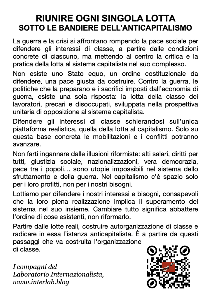 La guerra e la crisi si affrontano rompendo la pace sociale per difendere gli interessi di classe, a partire dalle condizioni concrete di ciascuno, ma mettendo al centro la critica e la pratica della lotta al sistema capitalista nel suo complesso.
